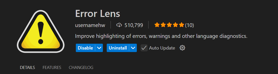 - 为什么必装:VS Code 默认的波浪线提示往往不够直观,需要鼠标悬停才能看清具体报错。Error Lens 直接将错误信息行内渲染在代码的尾部。这意味着在你不小心漏掉一个冒号或者缩进错误的瞬间,红色的报错信息就会直接怼在你眼前。这种零延迟的反馈循环能极大地减少调试时间,让你在编写代码时保持连贯的思路。